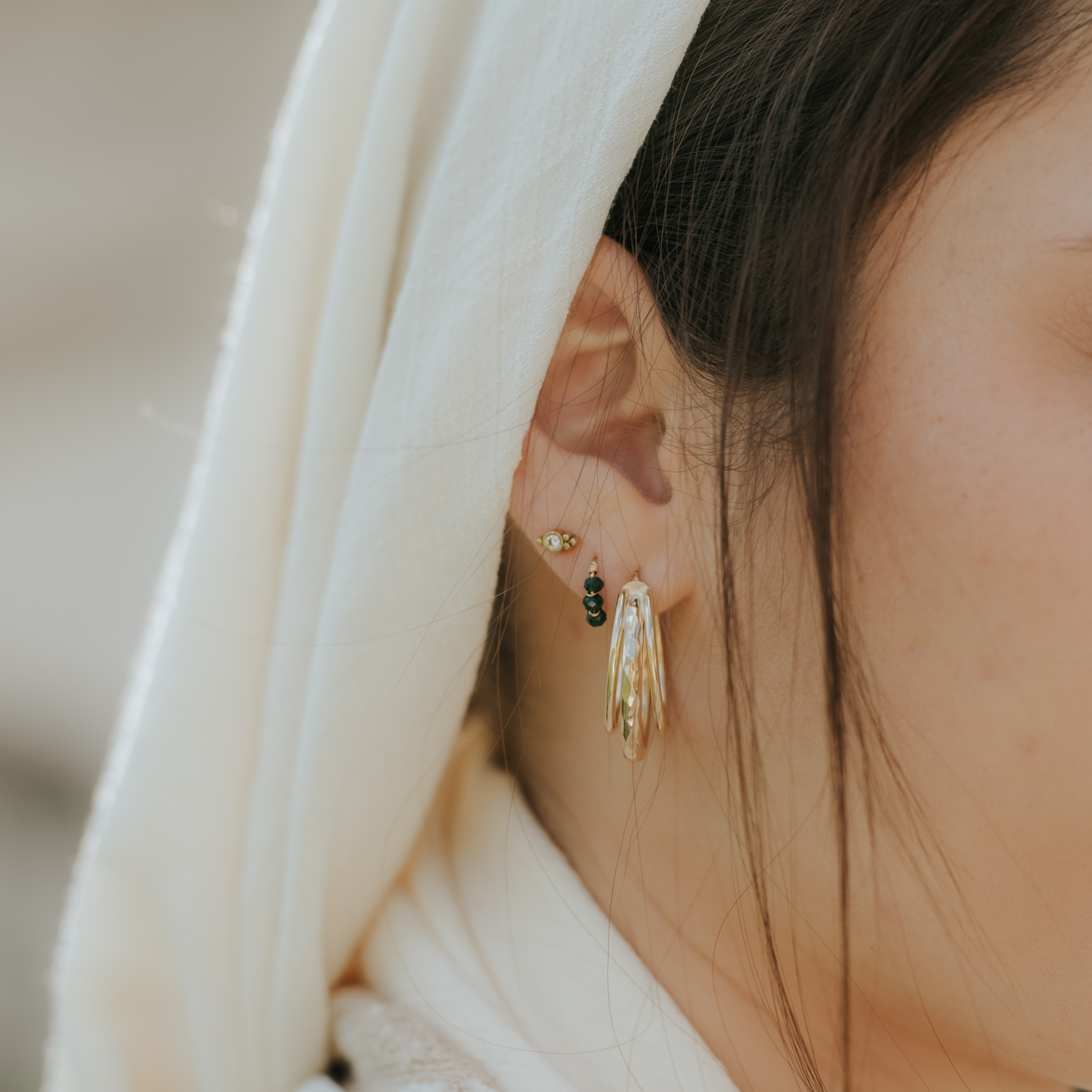 עגיל עשוי זהב 14K, עם שלושה חרוזים בגוון ירוק עמוק בעדינות מהאוזן.הנגיעה הצבעונית מוסיפה עומק ואופי, ומשתלבת יפה לצד עגילים נוספים ליצירת מראה עשיר והרמוני.