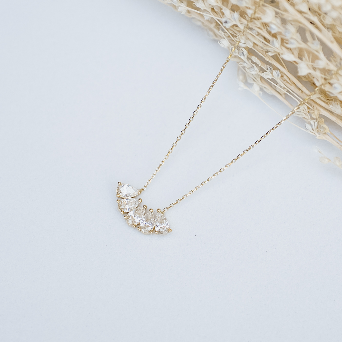 שרשרת מניפת טיפות ייחודית ועדינה, משובצת קריסטלים יפהיפיים בגון שקוף/אבן האודם: בורדו-ורוד עמוק, עשויה זהב 14K ומרהיבה ביופיה.